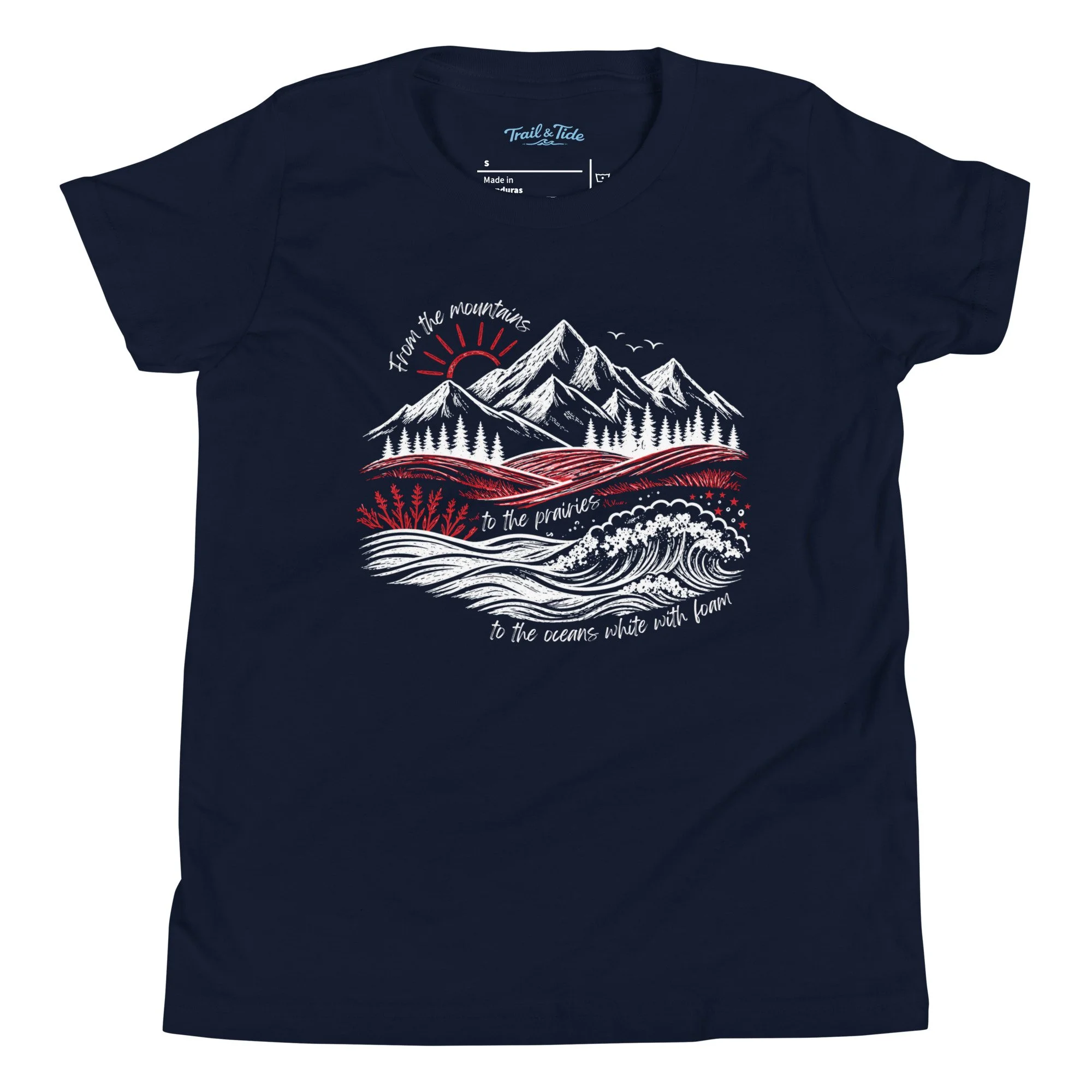 Inspired by the timeless words of America the Beautiful, this hand-drawn design captures the landscapes that shape our story — wide skies, rolling fields, and oceans white with foam. Printed in classic red, white, and blue on a deep navy backdrop, it brings a nostalgic, all-American feel to everyday play.