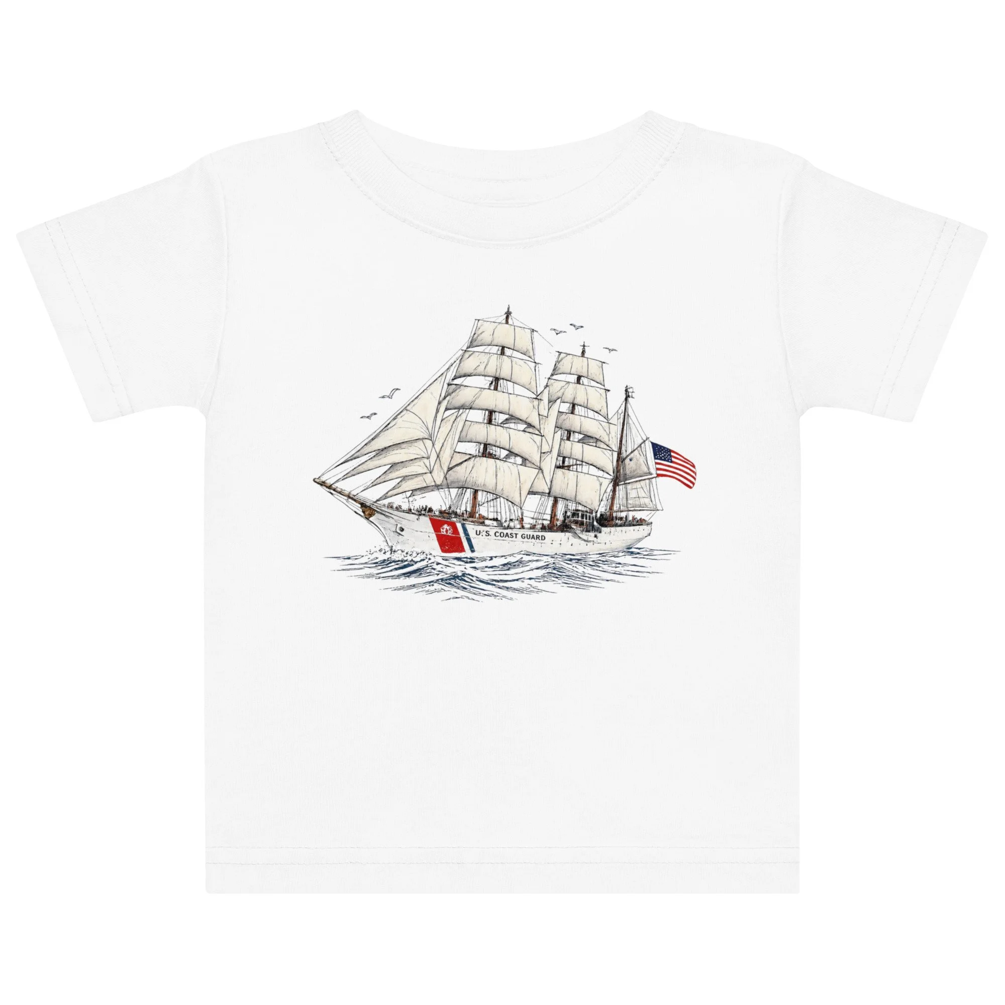 Inspired by the iconic Coast Guard tall ship, this hand-drawn design captures the beauty of a vessel in motion — strong, steady, and built for adventure. Set in classic red, white, and blue, it brings a timeless, all-American feel to a piece made for everyday exploring.