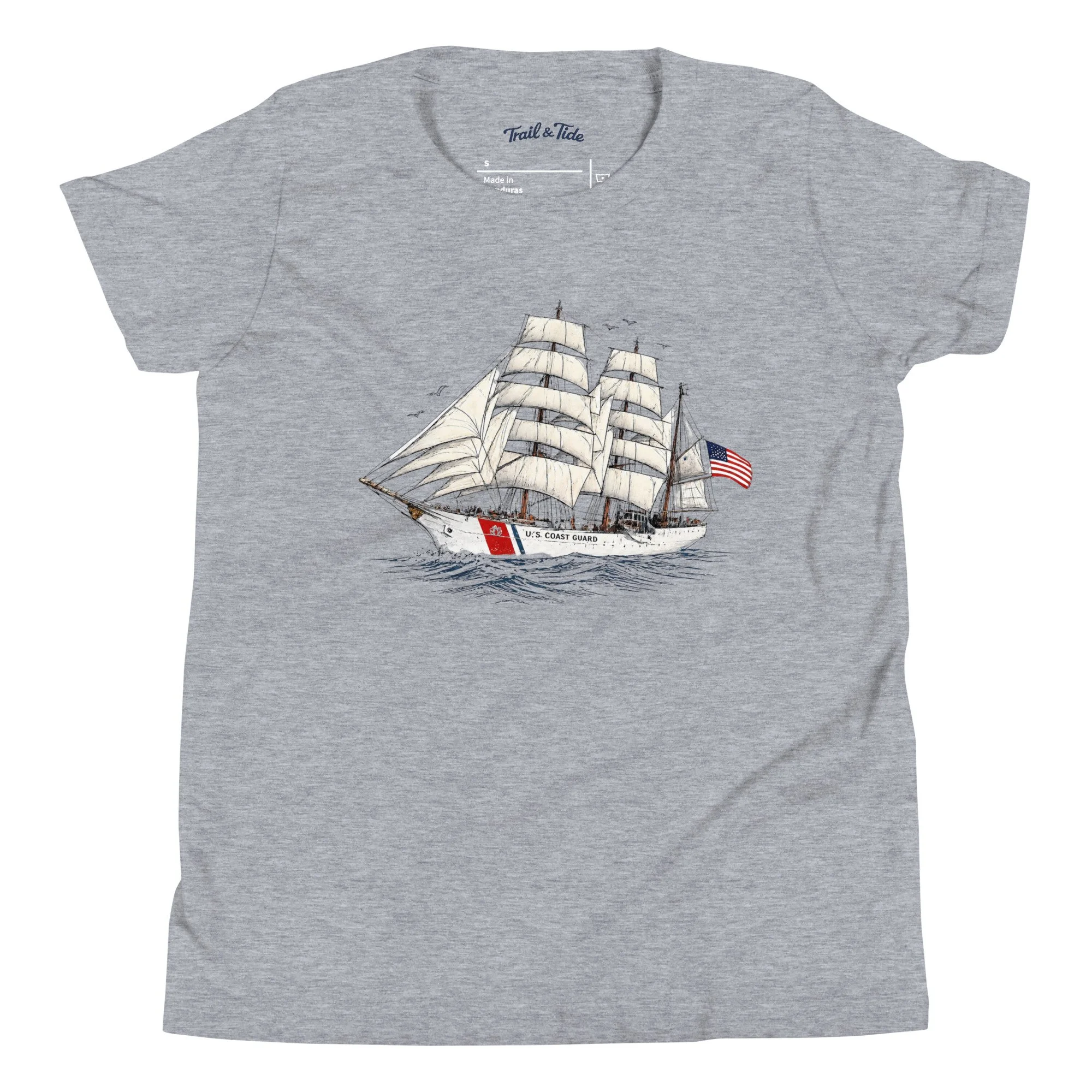 Inspired by the iconic Coast Guard tall ship, this hand-drawn design captures the beauty of a vessel in motion — strong, steady, and built for adventure. Set in classic red, white, and blue, it brings a timeless, all-American feel to a piece made for everyday exploring.
